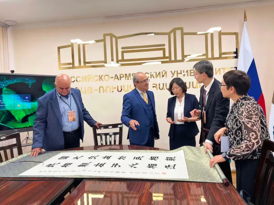 此外,代表团还与俄罗斯-亚美尼亚大学孔子学院负责人及师生代表座谈,就汉语教学推广、跨文化沟通与青年学习等主题展开了深入交流。